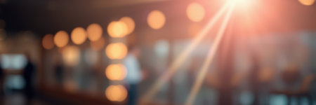 Bright lens flare illuminates a bustling cafe filled with warm light and cozy ambience during the evening hours