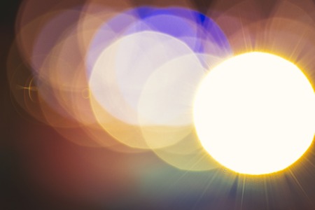 A dreamy abstract composition featuring soft defocused blue and orange bokeh circles illuminated by a bright golden sunburst flare with radiating beams of light.