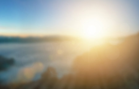 Natural fog and mountains sunlight background blurring, misty waves warm colors and bright sun light. Sky sunny color orange light patterns, abstract flare evening on clouds blur.