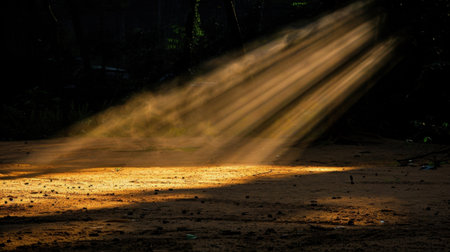 Beautiful beam of sunlight filters through trees, casting warm glow on sandy ground. interplay of light and shadow creates serene and tranquil atmosphere in nature