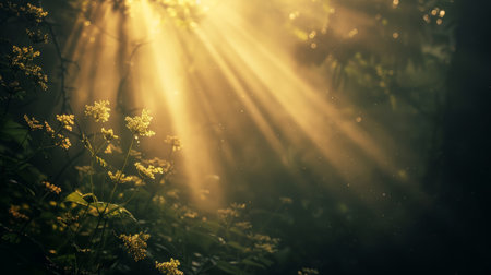 Intense golden sunbeams dramatically pierce through the dense green canopy of a forest. The light rays are clearly defined, creating a striking visual effect as they descend from the unseen sun above. The beams illuminate the misty air and cast long, soft shadows on the grassy forest floor. The leaves and branches of the trees are silhouetted against the bright light, adding to the mystical and ethereal atmosphere. The overall mood is one of peace, wonder, and natural beauty, with a touch of...