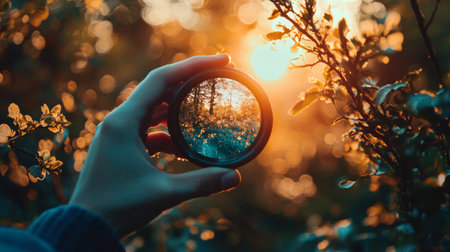 A close-up of a camera lens held by a hand capturing a scenic view with golden hour lighting, symbolizing focus and perspective.