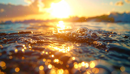 Golden sunset light illuminates ocean bubbles and the rippling water surface, creating bokeh effects.