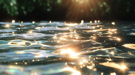 Close-up of water surface with sunlight reflections, showcasing ripples and shimmering patterns, creating a calming atmosphere and highlighting natural beauty