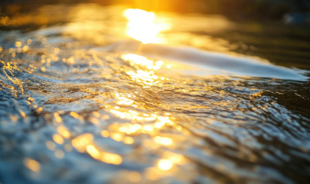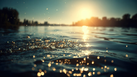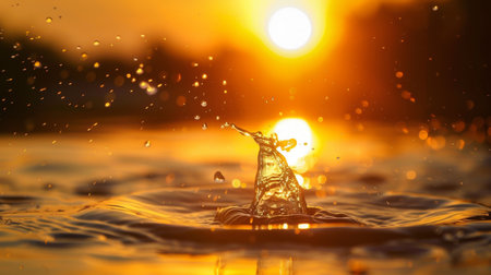 A peaceful scene depicting shimmering water with splashes under warm sunlight, creating a tranquil atmosphere. This image captures the beauty of nature at dusk.