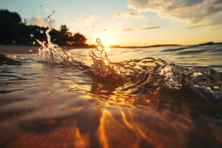 A dynamic close up shot of a sea wave splashing with water droplets in the air. The setting sun creates a warm glow over the water and a distant tropical shoreline.