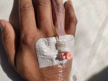 cannulation or venous catheter in the vein of human hand for blood infusion and sample collection