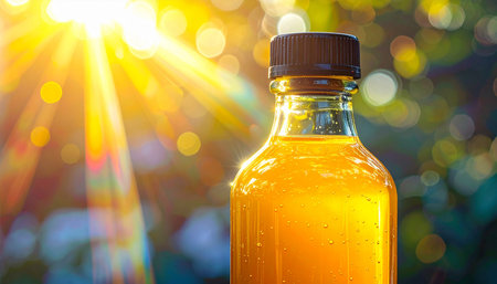 A glass bottle filled with golden liquid is illuminated by bright sun rays with a bokeh background.