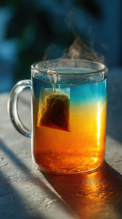 A beautifully styled glass cup filled with golden tea, capturing the essence of warmth and relaxation. The play of light and shadow creates an inviting atmosphere.