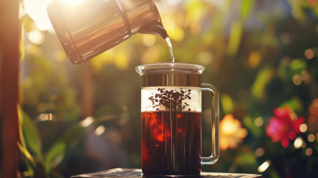 A serene image capturing freshly brewed coffee being poured into a French press, set against a vibrant natural backdrop in warm morning light.
