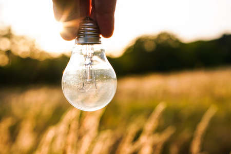 guy holds an electric light bulb in a field at sunset, Background Field grass.