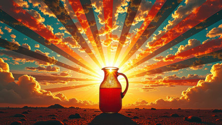 That the image is generated using AI. Radiant sunrise with glass pitcher silhouette on rocky terrain.