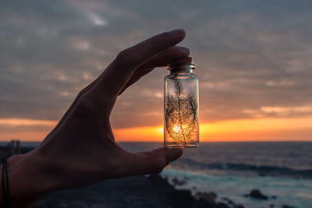 Closed green plant with soil in a glass jar at sunset