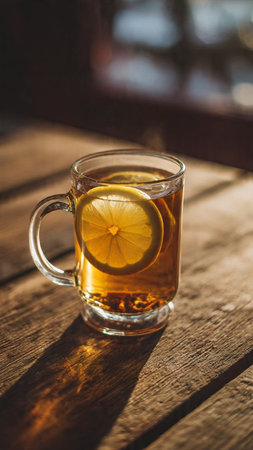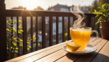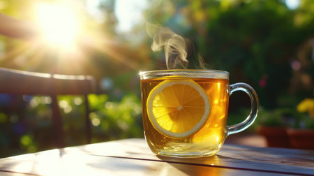 A steaming cup of lemon tea sits on a rustic table bathed in warm sunlight The window frame casts soft shadows on the wooden surface, creating a cozy and inviting atmosphere Perfect for a relaxing morning ritual, this image evokes feelings of warmth, comfort, and a refreshing start to the day AI Generative