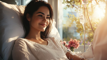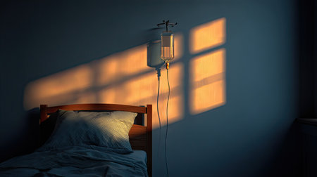A tranquil hospital room illuminated by soft natural light, featuring an IV stand beside a neatly made bed, creating a peaceful atmosphere for recovery.