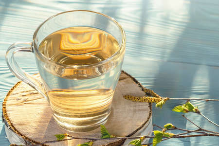 Birch juice on a blue wooden table in a glass mug, next to a branch of birch with young leaves, copy space, place for text