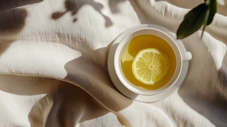 Cup of green tea with lemon on the bed. Top view