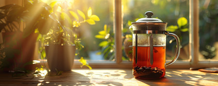 Morning serenity with French press coffee near a sunlit window, highlighting the press and streaming light