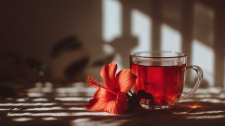 A glass cup filled with vibrant herbal tea and a fresh hibiscus flower, beautifully lit by natural light, creating a serene and inviting atmosphere.