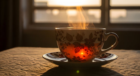 A floral tea cup filled with hot tea emitting elegant swirls of steam backlit by the morning sun near a window. The warm glow and rising smoke create a cozy and atmospheric moment of relaxation.