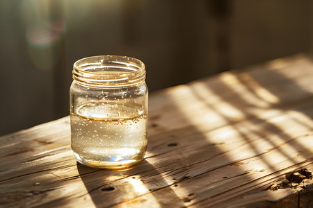 A clear glass jar, partially filled with water, sits on a rustic wooden surface. Sunlight casts shadows across the wood, creating a warm and inviting scene. The water looks refreshing.