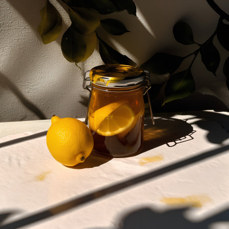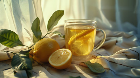 A refreshing glass mug of lemon tea accompanied by fresh lemons and leaves, basking in the warm, natural sunlight.