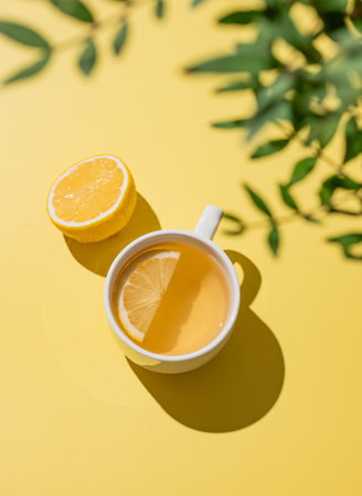 tea cup with lemon top view with natural light and shadow, space for text