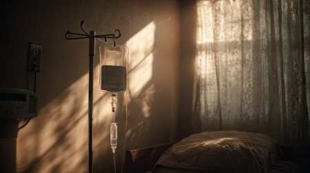 A close-up of a medical IV drip in a softly lit room, with sunlight streaming through curtains, creating a tranquil atmosphere ideal for healing and patient care.