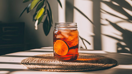 A vibrant glass of iced tea with citrus slices rests on a natural fiber placemat in a sunlit room. Ideal for summer refreshment and relaxation.