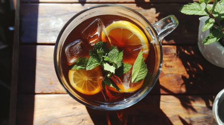 Enjoy a refreshing glass of iced tea, garnished with lemon slices and mint leaves, perfect for summer relaxation. Ideal for beverage lovers.