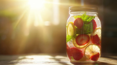A jar of infused water with strawberries, mint, and lemon slices, glowing in natural sunlight