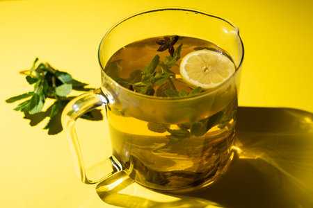 Green tea with lemon mint and star anise on a yellow background.