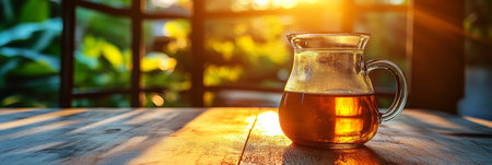 Warm Glow Refreshing Beverage in Glass Pitcher on Sunlit Counter, Tranquil Nature Backdrop