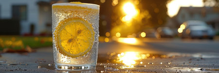 A glass filled with sparkling water and lemon slices sits on a sunlit street, capturing the warmth of summer.