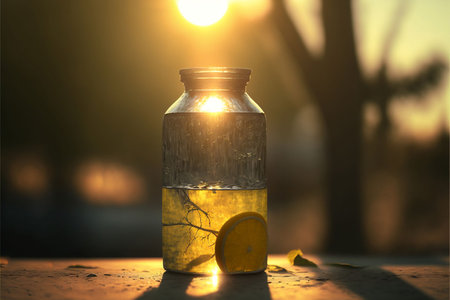 An AI generated illustration of a glass jar with a piece of lemon in the water against the sunset