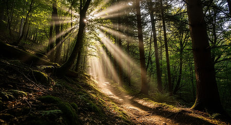 Golden sunbeams pierce through a vibrant forest canopy, illuminating a breathtaking landscape scene. Shafts of sunlight cascade through the trees, creating stunning beams of light and shadows amidst the lush green foliage. This natural scenic view showcases the beauty and peaceful serenity of the woods, perfect for evoking inspiration and a sense of freedom. Ideal for projects needing imagery of nature, the outdoors, and summer scenes, this image offers a tranquil and idyllic atmosphere.