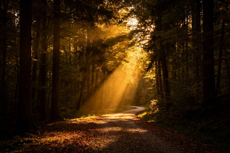 Golden sunbeams pierce through a dense forest canopy, creating a dramatic light show on a winding forest floor.