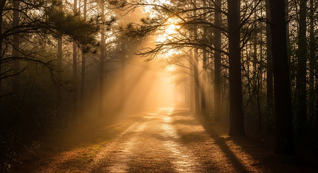 A peaceful forest scene showcasing a pathway illuminated by soft rays of sunlight filtering through tall trees, creating a serene and tranquil atmosphere for nature lovers.