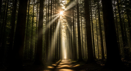 Sunbeams filter through tall trees serene forest, creating beautiful silhouettes and warm, golden atmosphere. light enhances natural beauty of woodland scene, evoking sense of peace