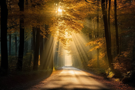 The suns rays filter through the treelined highway casting a warm golden glow upon the road. The vibrant colors of the changing leaves . AI generation
