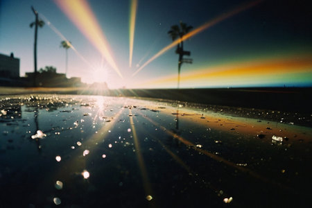 A circular sun flare emitting intense light beams and rainbow-like refractions on a black surface.