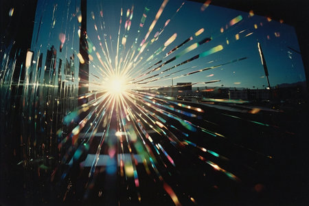 Iridescent light rays creating a vibrant overlay texture on a reflective surface
