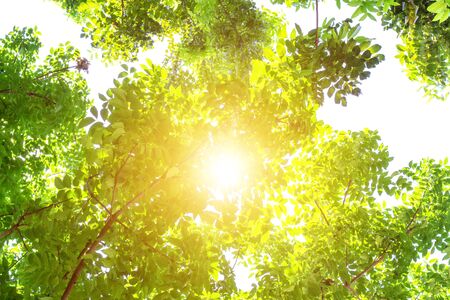 Beautiful summer in the forest. Tree with green leaves against the sunny sky. Natural background. Beauty world