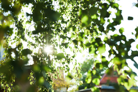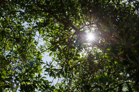 Fresh green leaves in the forest frame the sun in the middle and form rays of light.