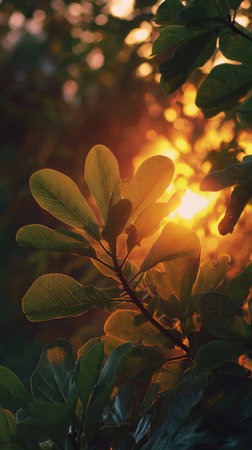 Vibrant greenery bathed in sunlight, offering natural glow. Sunlight filters through leaves.