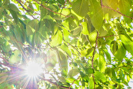 Close up photography of spring background featuring fresh green leaves and sunlight through branches