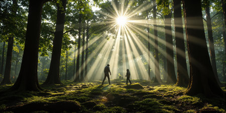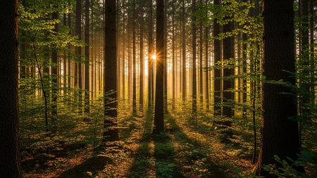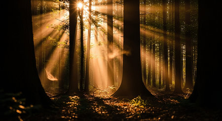 Sunbeams filter through tall trees serene forest, creating beautiful silhouettes and warm, golden atmosphere. light enhances natural beauty of woodland scene, evoking sense of peace