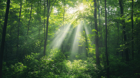 Golden sunbeams pierce through a vibrant forest canopy, illuminating a breathtaking landscape scene. Shafts of sunlight cascade through the trees, creating stunning beams of light and shadows amidst the lush green foliage. This natural scenic view showcases the beauty and peaceful serenity of the woods, perfect for evoking inspiration and a sense of freedom. Ideal for projects needing imagery of nature, the outdoors, and summer scenes, this image offers a tranquil and idyllic atmosphere.