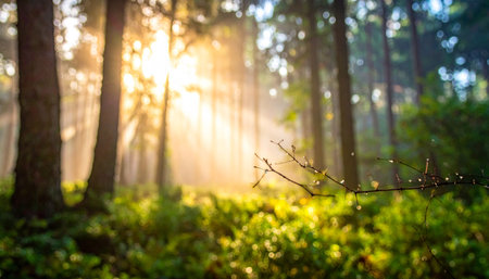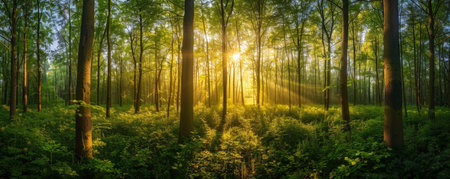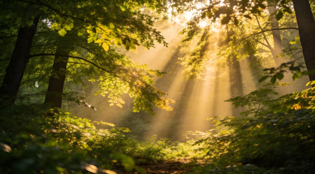 Lush green forest with sun rays filtering through tall trees creating warm morning glow
