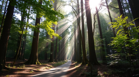 A peaceful forest scene showcasing a pathway illuminated by soft rays of sunlight filtering through tall trees, creating a serene and tranquil atmosphere for nature lovers.